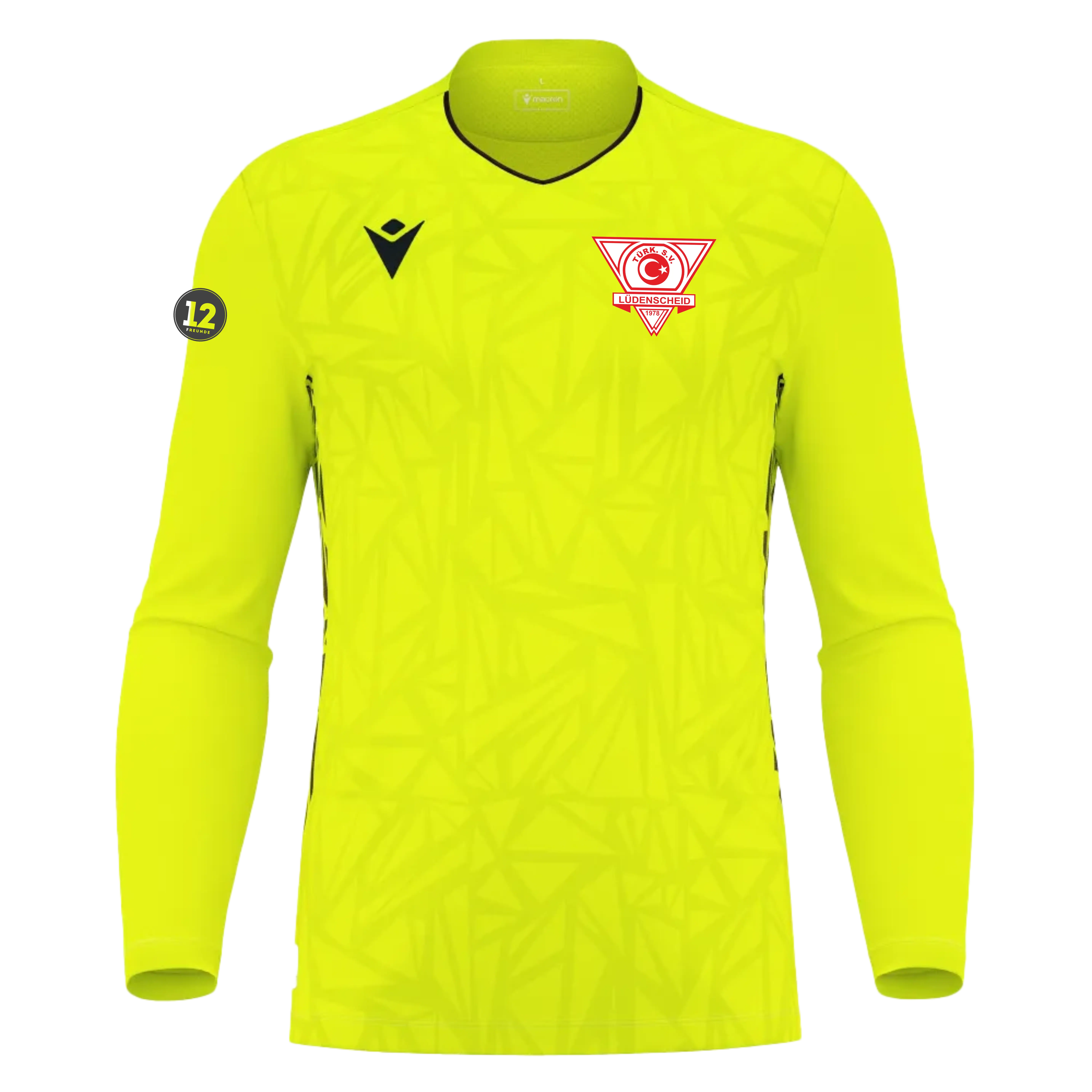 Torwarttrikot mit vollständiger Fertigung aus Eco Fabric, zu 100 % aus recyceltem PET. V-Ausschnitt aus Strick mit Paspeln auf der Vorderseite. Die Rückseite besteht aus Eco-Micromesh, um eine hervorragende Atmungsaktivität zu gewährleisten. Das Trikot verfügt über eine sublimierte farblich abgestimmte Textur auf der Vorderseite und Eco-Mesh-Einsätze an den Seiten, welche die gleiche Textur mit Macron Hero aufgreifen. In 4 Farbvarianten erhältlich.